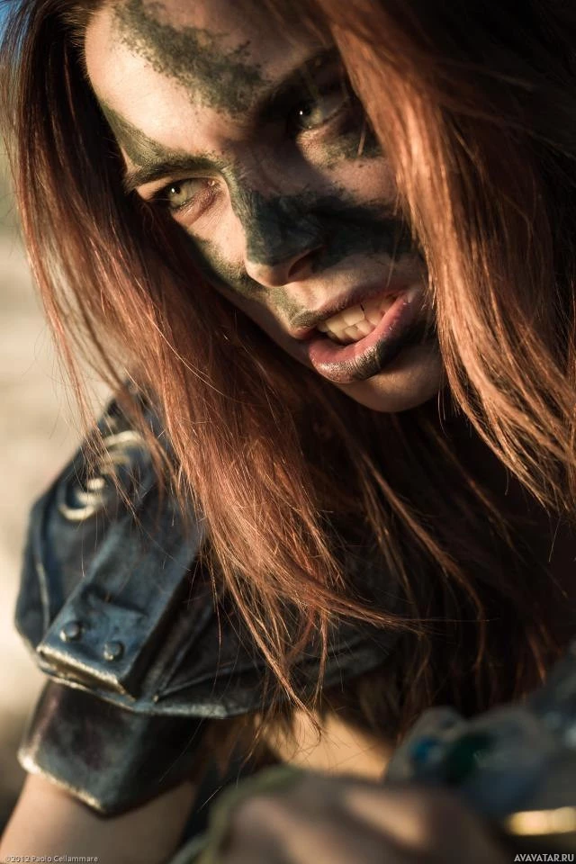 video game series. She is wearing armor and has dirt and camouflage paint on her face, which suggests she might be in