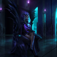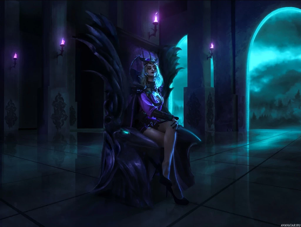 the video game "League of Legends," dressed in cosplay attire. This character is known as Vel'Koz, and she is seated on a throne that resembles the kind typically found within fantasy or
