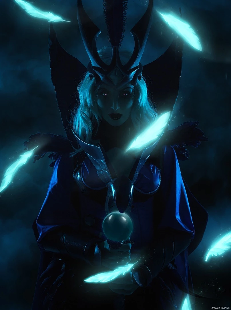 cosplay form, showcasing her dark and mystical appearance with horns on her head and a cloak adorned with feathers or leaves, suggesting an elemental or nature-inspired theme to her design. In her hands, she holds a staff topped with a gem, which is part of her character's abilities in the game. The overall mood of the image is mysterious and enigmatic, fitting