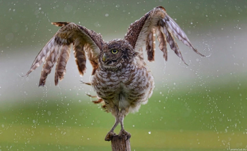 На снимке изображена молодая сова в полете с полностью вытянутыми крыльями, ловя воздушные потоки. Похоже, что это происходит в дневное время, и на заднем плане виден дождь или туман, что добавляет динамический элемент к сцене.