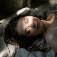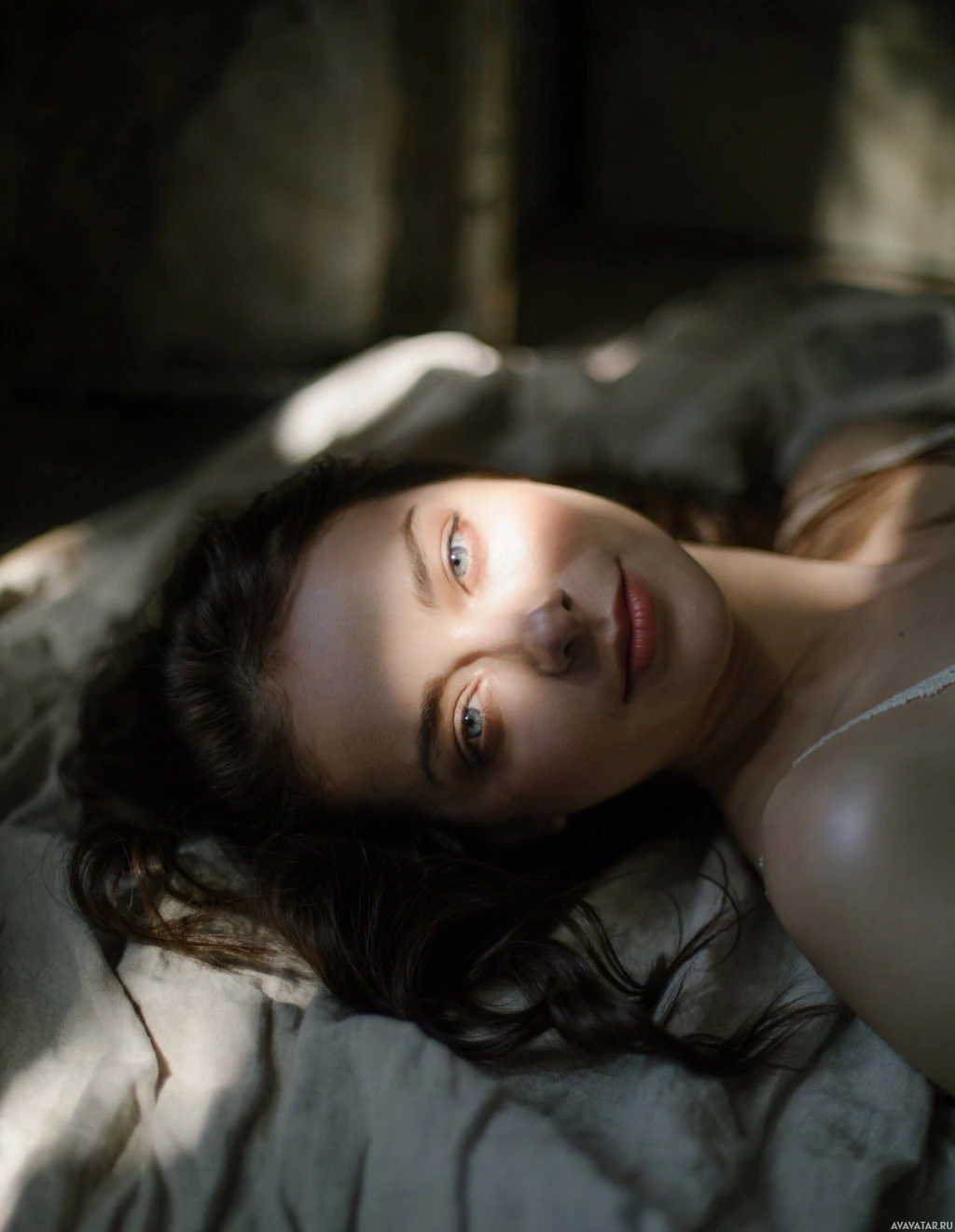 a soft light illuminating her face, which could be sunlight filtering through a window or an open space. The setting seems to be indoors, with a hint of