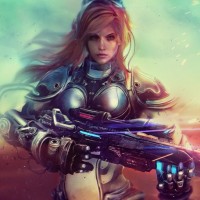 a female character in an action pose, reminiscent of the characters from the video game "StarCraft" set in the Nova Terra universe. She is wearing armor and holding what appears to be