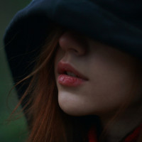 red hair who appears to be wearing a hood. Her lips are slightly parted, and she has a thoughtful or contemplative expression on her face. The overall tone of the picture is quite moody and could suggest a theme of solitude or introspection.
