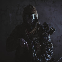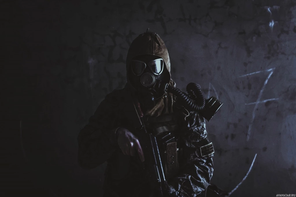 a gas mask and carrying what appears to be a weapon. They are seated in an environment that looks like it could be