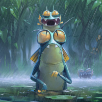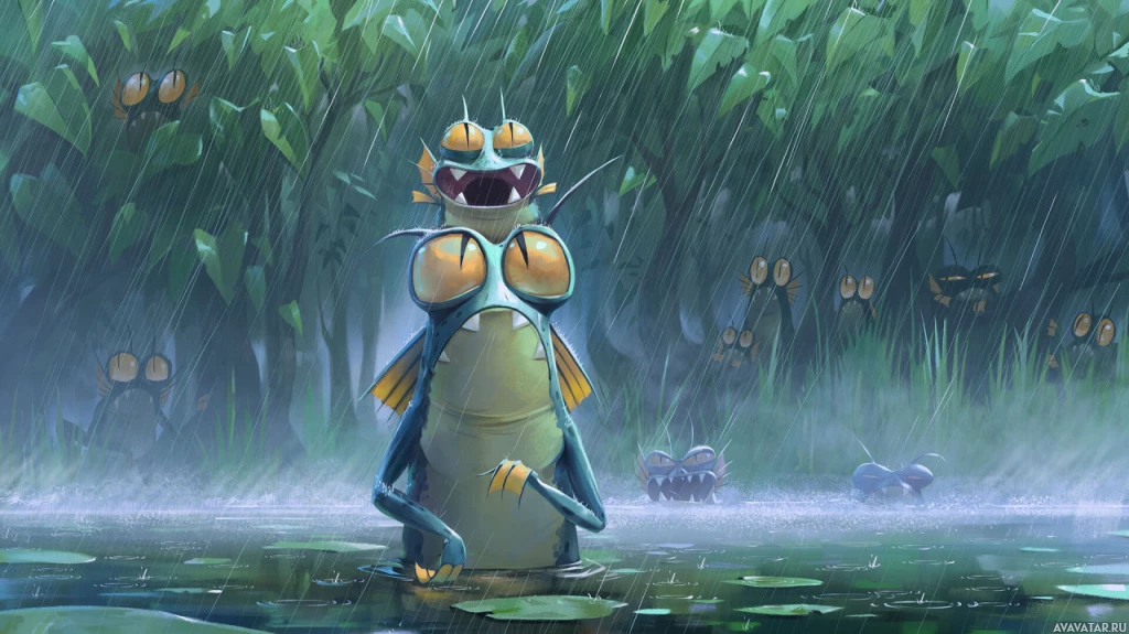 animated creature with the body of a fish and the head of a human, standing amidst other smaller creatures that resemble tadpoles or amphibians. The setting is misty and overcast, suggesting