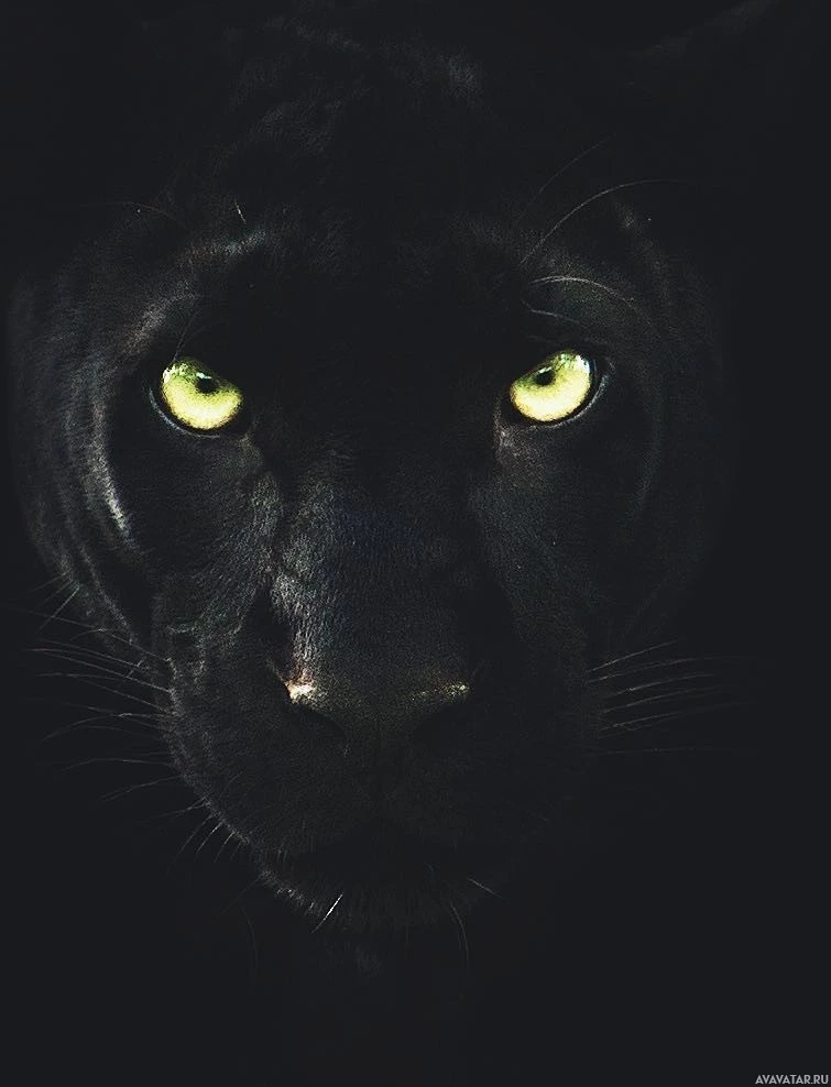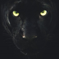 a black panther's face. The animal is looking directly at the camera with its eyes wide open, revealing