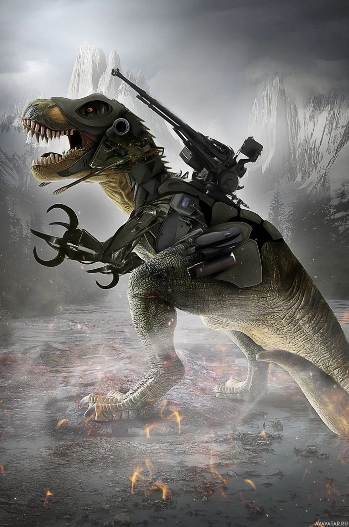 The image features an anthropomorphic T-Rex, which is a type of dinosaur. This depiction has human arms and hands holding onto a weapon, likely a rifle or shotgun, suggesting that the creature might be used for