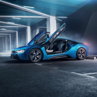The image shows a blue BMW i8