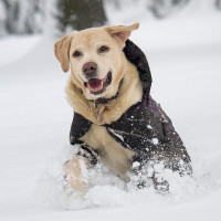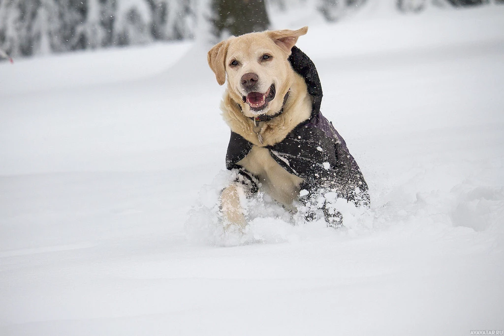 На картинке изображена собака. Собака выглядит как лабрадор-ретривер, который является животным. Собака находится в заснеженной среде с ногами, поднимающими снег вокруг нее, что указывает на то, что она, вероятно, играет или бежит по снегу.