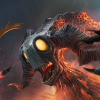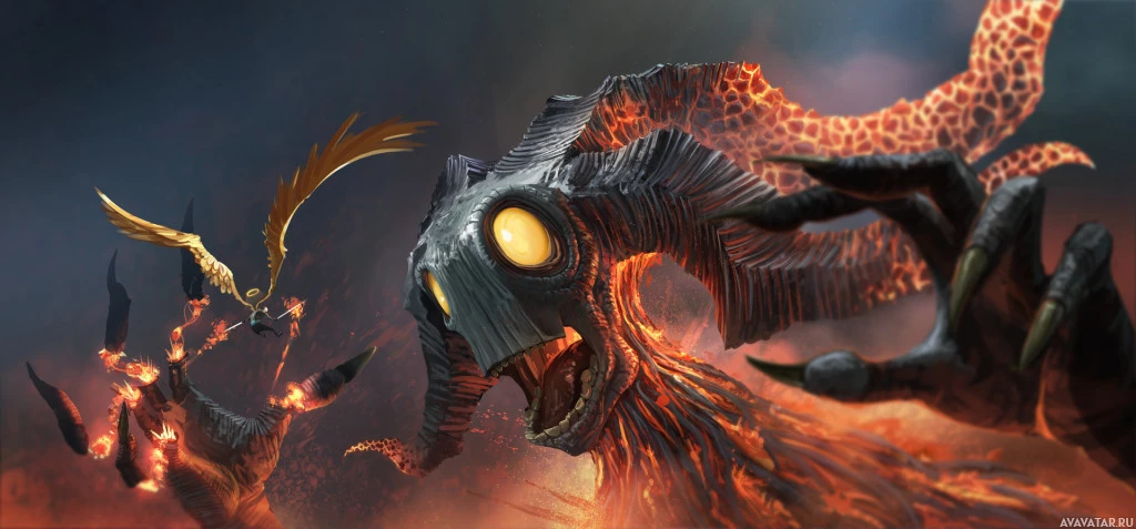 a demonic figure at the center, surrounded by flames and lava-like effects. This character has