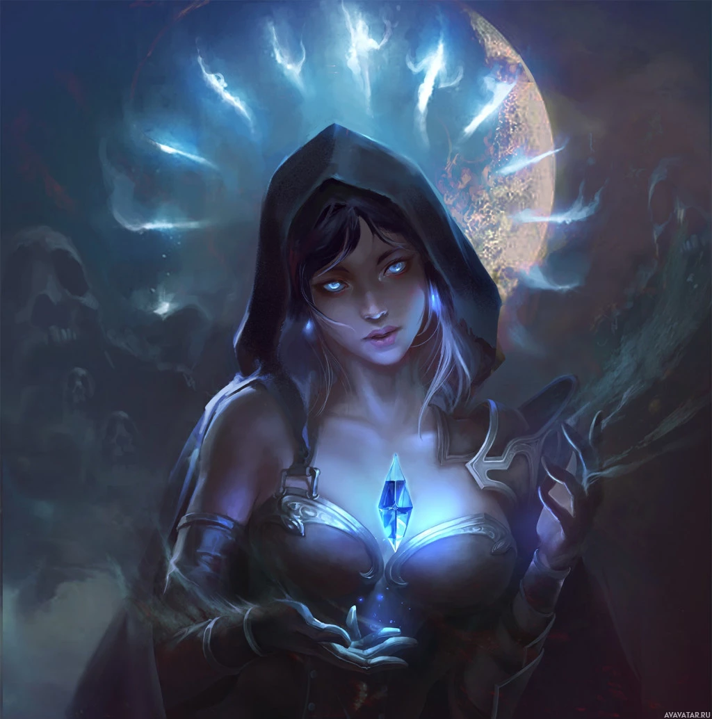 a female character who appears to be from a fantasy setting. She is wearing a cloak and holding what looks like magical energy in her hand, which could suggest she has