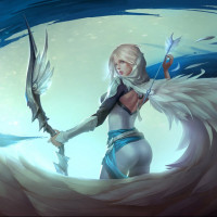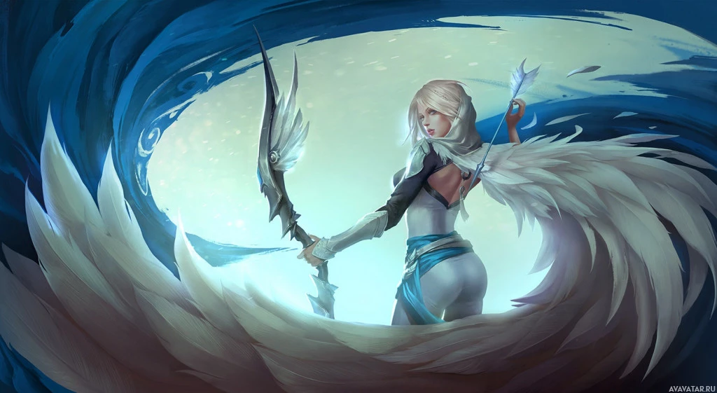 an angelic figure with wings and a halo around her head. She is holding a bow and arrows, suggesting she might be involved in combat or hunting within this