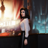 a cosplay event or photo shoot where the individual is portraying the character of Elizabeth as she might appear in her adventures in the game. The focus on the outfit and the ambiance suggests that this is not an actual