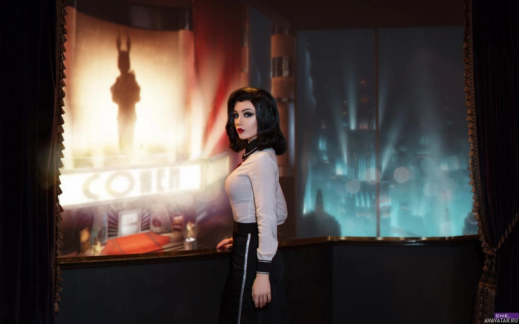 scene from the game but rather a staged recreation to showcase the costume and the atmosphere associated with the "Bioshock Infinite" setting.