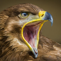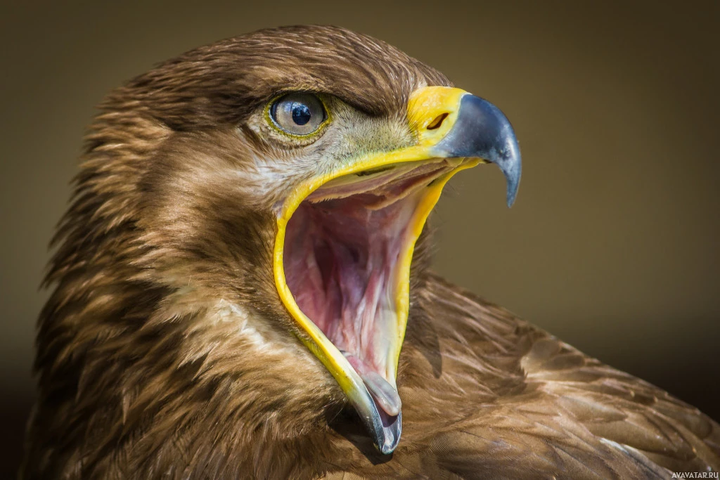 На картинке изображена птица, в частности орел. Он, по-видимому, захватывается в середине движения или делает вокализацию, как предполагает его открытый клюв и вспыхнувшие перья, что может указывать на возбуждение, агрессию или территориальное поведение.