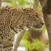 a leopard in the wild. It appears to be leaning forward with its head close to some branches or foliage, possibly sniffing or exploring its surroundings. Leopards are known for their distinctive