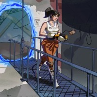 the video game "Portal." She is depicted in a pose that suggests she might be entering or exiting a portal. The setting appears to be industrial, with pipes and machinery visible around her, which fits the aesthetic often associated with the game. The character is wearing an orange jumpsuit with