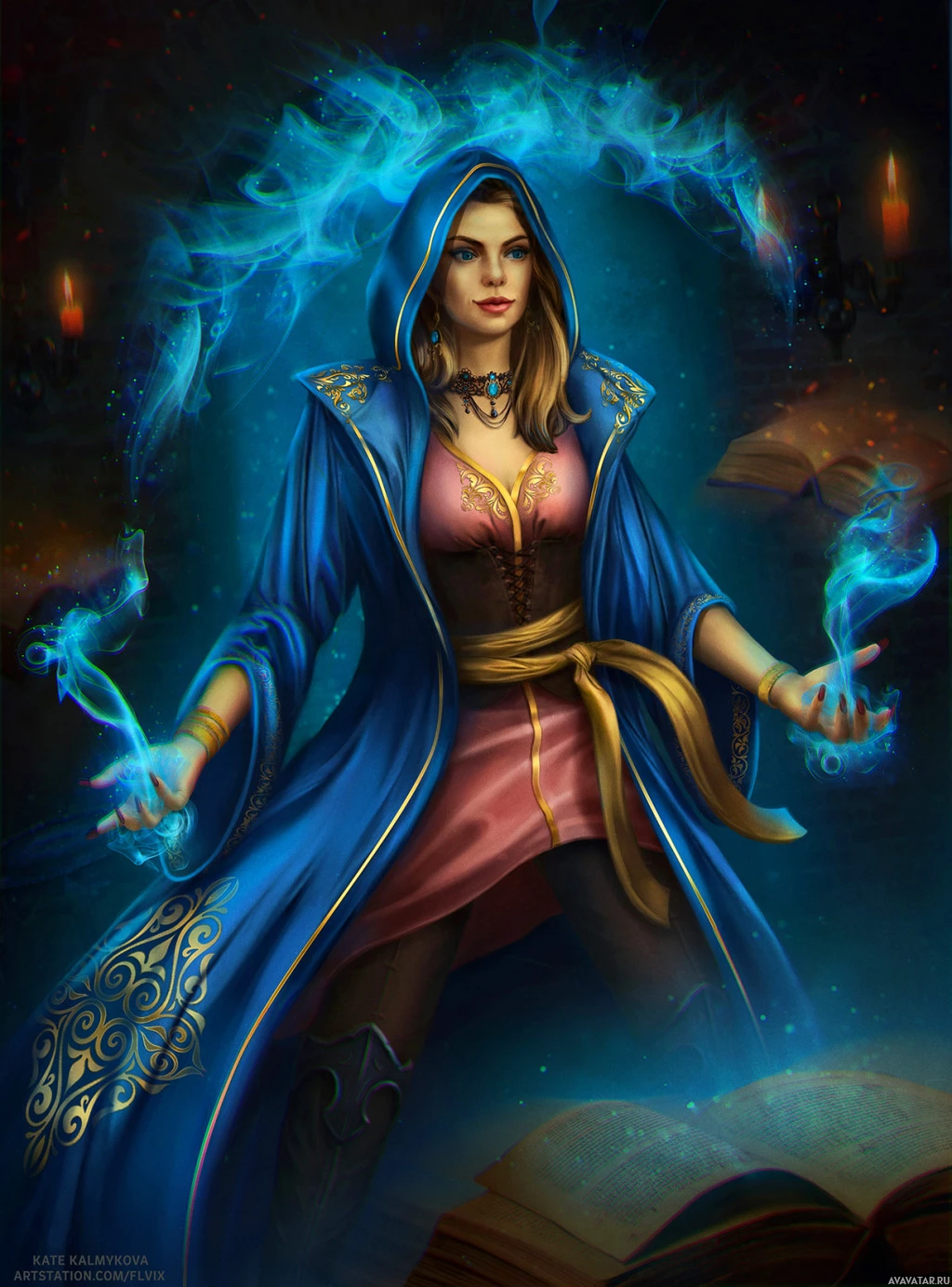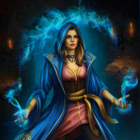 a fantasy character who appears to be a witch or sorceress, as indicated by the hood she is wearing and the magical elements around her. She has an ethereal appearance with