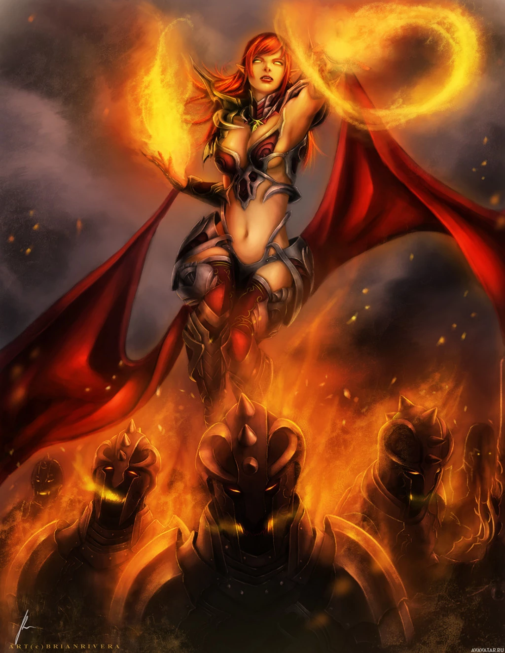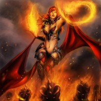 red hair, is wearing armor with a dragon emblem on it, and holds a staff that seems to be creating flames as she gestures. The background shows an inferno with figures that could be considered succubi based on their appearance; they are not fully human but have humanoid forms with
