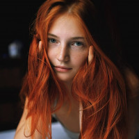 a relaxed posture, resting her head on one hand while the other is casually placed near her face. Her gaze is directed towards something or someone off-camera. The setting seems to be