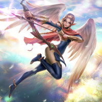 an animated character that appears to be an angelic being. The character is depicted with wings, holding a bow and arrow, and is shown in the act of aiming or shooting an arrow towards something outside the frame. There's also some sort of magical or mystical energy indicated by