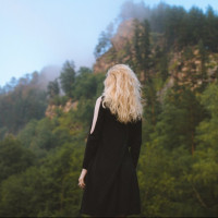 the natural environment around her. The scene suggests a serene and peaceful atmosphere, possibly early morning or late afternoon given
