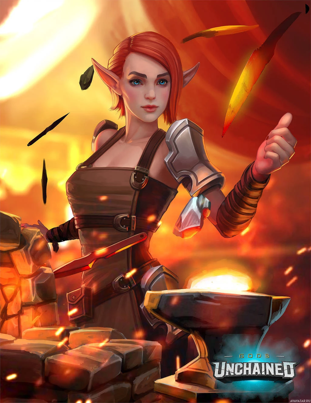 a fantasy setting or game. There are elements like fire and flames around her, which could indicate a dramatic or intense scene. In the background, there is a logo that reads "Unchained," which might be related to the character's name or