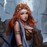 The image shows an illustration of a red-haired girl with an ethereal or mystical appearance. She has a confident and alluring expression, with her right hand resting on a staff. Her attire includes a cape that appears to be magically levitating around her shoulders, suggesting she might possess some form of magic or enchantment. The background features