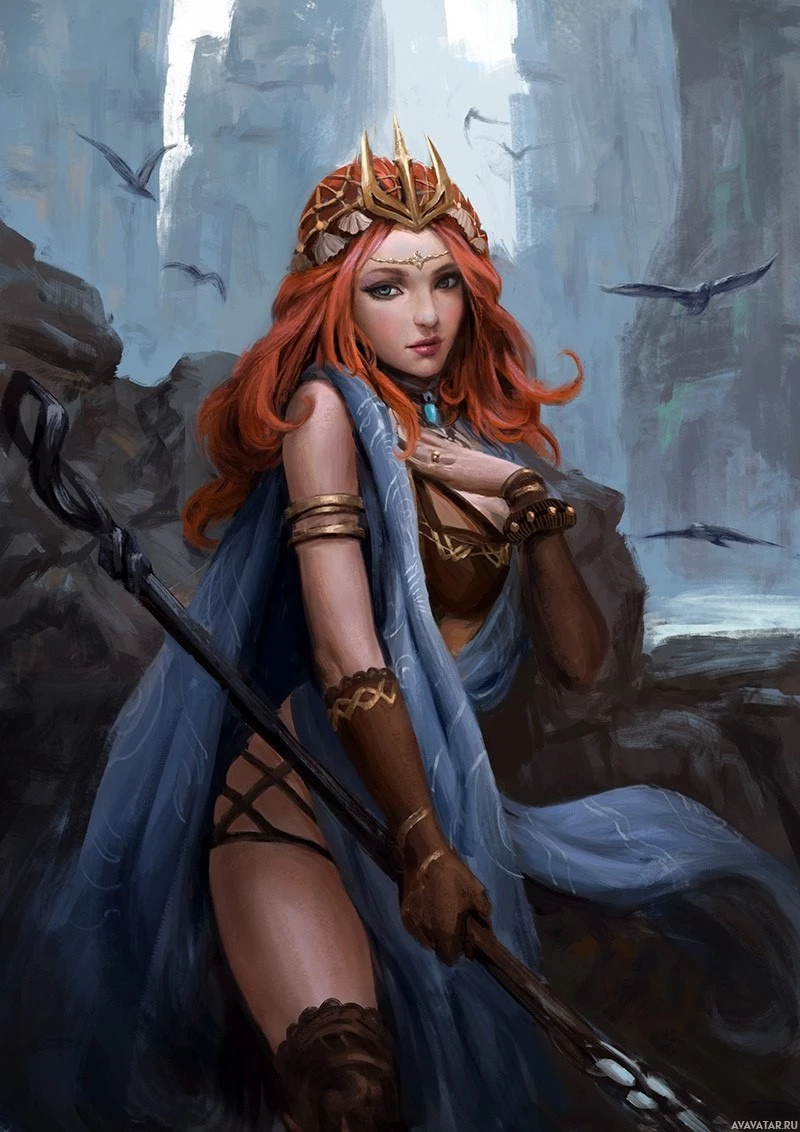 rocky cliffs with mist, which adds to the fantasy-like ambiance of the artwork. This character could be from a story or mythology where