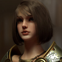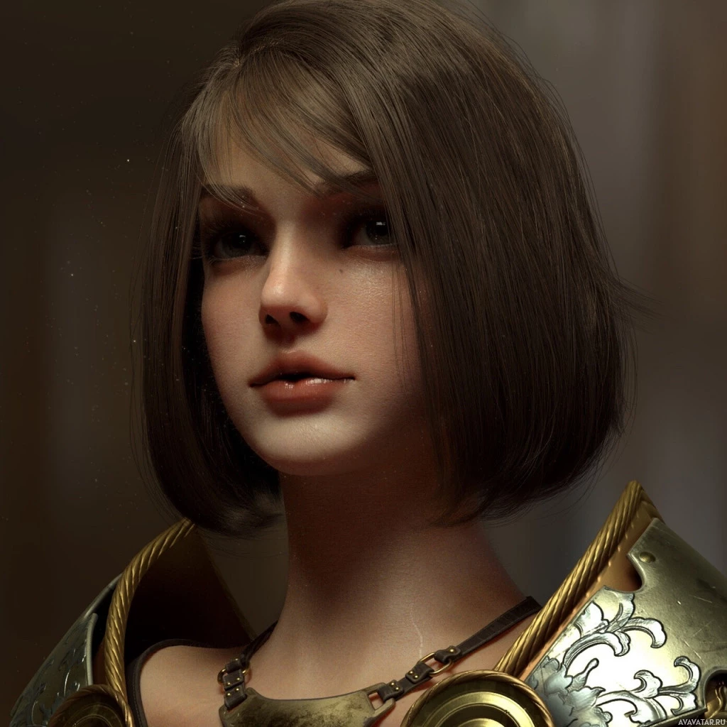 a fantasy setting, suggesting she could be a warrior or a character from a role-playing game or fantasy story. Her expression is neutral with a hint of determination or readiness. The lighting in the image highlights her features, giving her an almost lifelike appearance despite being