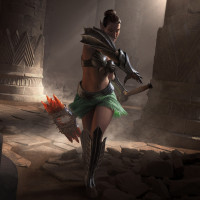 armor pieces on her torso and arms. The setting has a stone-like texture, possibly indicating