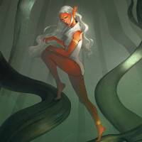 long hair and pointed ears, which are typical characteristics of elves in fantasy media. The surrounding environment is dark and forested, creating