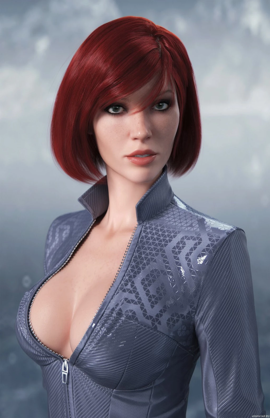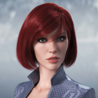 a female character with red hair. She has a sleeveless jacket with intricate detailing and