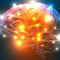 a human brain, colored in shades of orange and yellow. Surrounding the brain are various glowing blue dots that could symbolize neurons or other components of