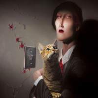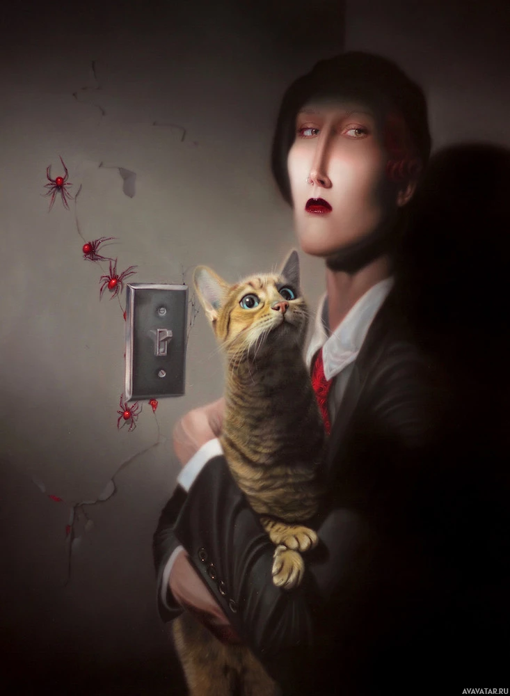 small holes in the wall behind them, through which you can see some kind of insects or possibly spiderwebs. The overall atmosphere of the picture is mysterious or ominous due to