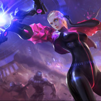 blonde hair and is wearing a futuristic or cyberpunk-style outfit that could suggest she might be a part of a game or a story within this genre. The background has a neon, high-