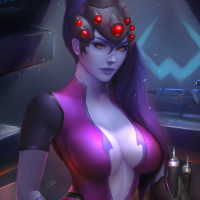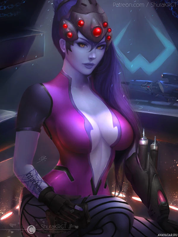 The image depicts an animated character known as Widowmaker from