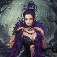The image depicts an animated character styled as a fantasy elf. She has pointed ears, purple hair with feathers, and is wearing a black corset and a cloak adorned with dark feathers. Her expression appears contemplative or serious. This image could be associated with fantasy themes in artwork or animation.