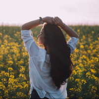 The picture shows a person from behind, leaning forward with their hands above their head. They are standing in what appears to be a field of golden wheat or flowers at sunrise or sunset, given
