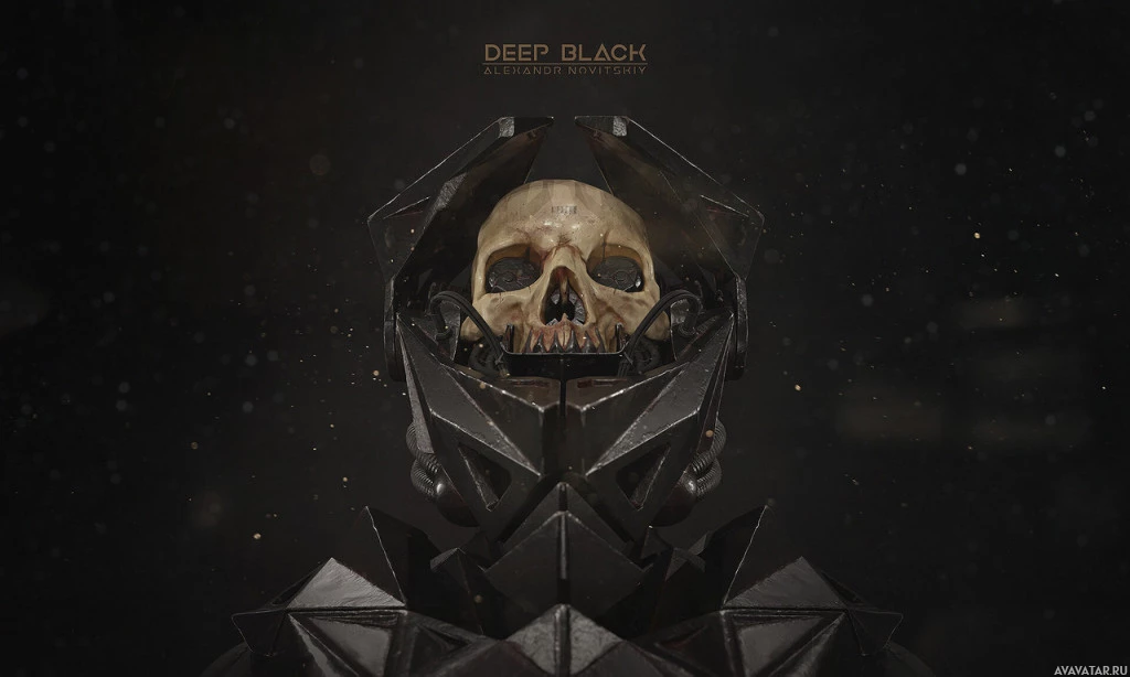 a dark background with what appears to be a crystalline or glass-like texture. There is text above the skull that reads "Deep Black." The artwork has a gothic and eerie vibe, possibly suggesting themes related to death or darkness.