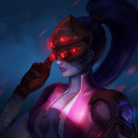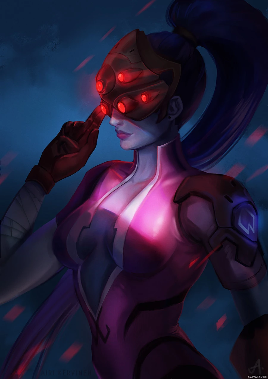 The image shows an artistic representation of Widowmaker, a character from