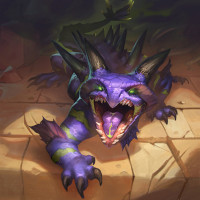 sharp teeth, and pointed ears, giving it an intimidating appearance. The creature is laying down on what looks like a stone floor or pavement, possibly in