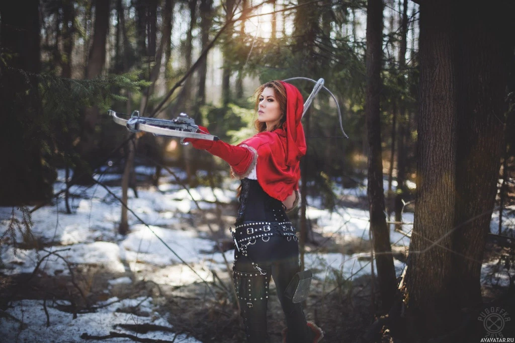 На картинке изображена молодая женщина с рыжими волосами в костюме, напоминающем Маленькую Красную Шапочку, в комплекте с красным капюшоном и плащом. Она держит арбалет и, кажется, находится в лесу. Вокруг нее деревья, что говорит о том, что она может быть в лесу. Освещение предполагает, что это может быть либо рассвет, либо сумерки из-за мягкого рассеянного солнечного света, освещающего сцену.