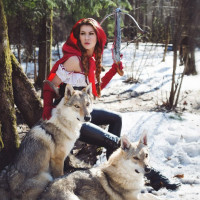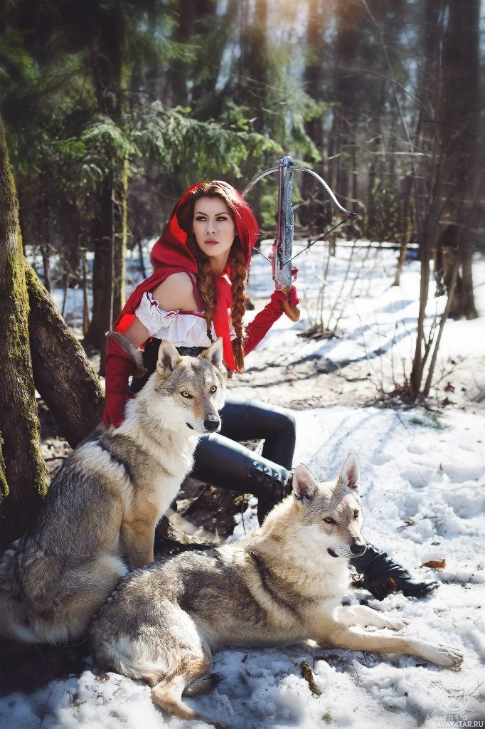 red hair holding a crossbow and wearing what appears to be a costume resembling a character from a fairy tale or fantasy story. She has two dogs at her feet; one on the left side of the photo and another on the right. They both seem to be wolves, given their size and appearance. The setting is in
