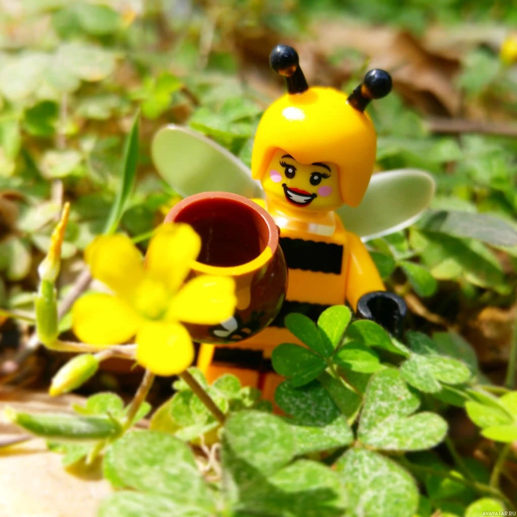 На картине изображена фигура пчелы Lego, которая выглядит как персонаж с похожими на человека чертами, такими как улыбающееся лицо и руки. Эта минифигурка Lego содержит то, что выглядит как маленькая чашка или контейнер, напоминающий цветок. Набор включает траву и растения, которые выглядят как цветы клевера, что указывает на то, что фигура может быть помещена в наружную среду с естественной зеленью.