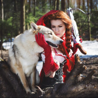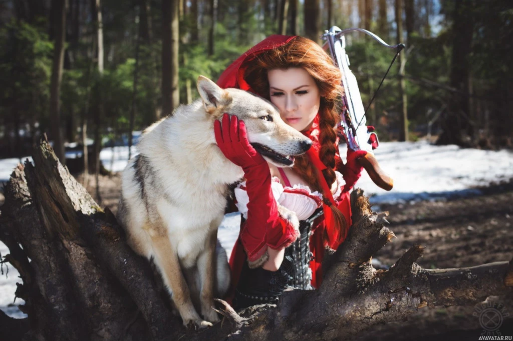 red hair wearing a Santa hat, sitting on the ground next to a large wolf. She is holding a crossbow, suggesting she might be involved in some form of archery or hunting activity. Both the woman and the dog are looking at the camera, creating