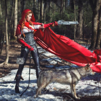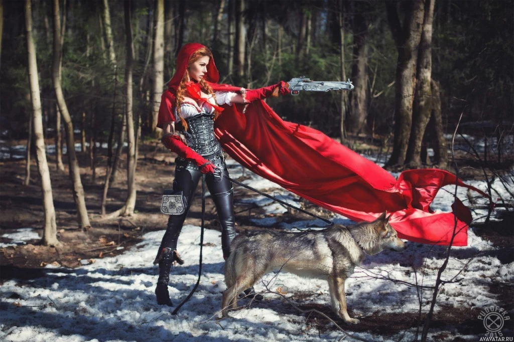 red hair and is wearing a costume with elements of fantasy or historical-style clothing, including a cloak and what appears to be armor. Her right hand is holding a gun aimed upwards towards the sky. There is also
