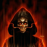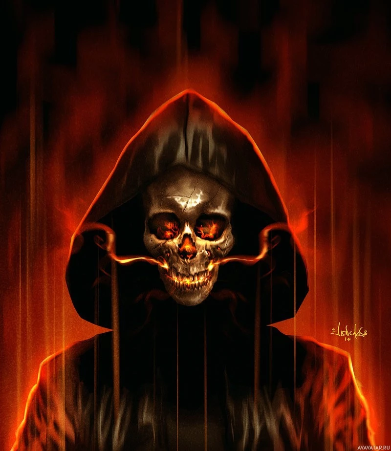 На картинке изображен персонаж, одетый в зловещий капюшон и маску черепа. Фон огненный, возможно, указывающий на ад или разрушение. Это иллюстрация или цифровое произведение искусства, призванное вызвать чувство опасности и сверхъестественного.