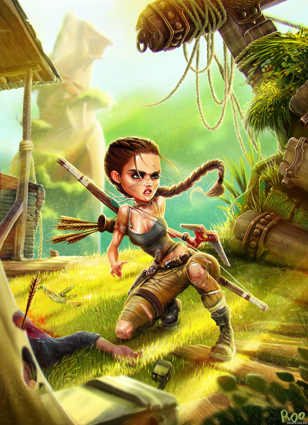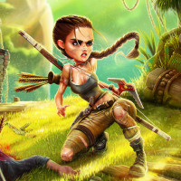 In the image, there is an animated character that appears to be a female adventurer, reminiscent of Lara Croft from