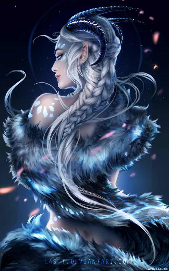 intricate designs, resembling the style one might expect from a character living in a mythical or magical setting. The background is dark with subtle light effects and what seems like a celestial body or an enchanted moon in the top left corner, adding to